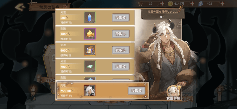 | ステージ3 | 忠誓の証(ポイント)×300 骨紋章(ガチャ・アイテム)×11 罪の鎖×6 |