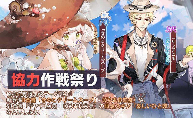 | 内容 | 協力作戦限定ステージ追加!新登場R食霊「きのこクリームスープ」(CV:本泉莉奈)や、SR食霊「サンデビル」(CV:中村太亮)の限定スキン「楽しいひと時」を入手しよう! |