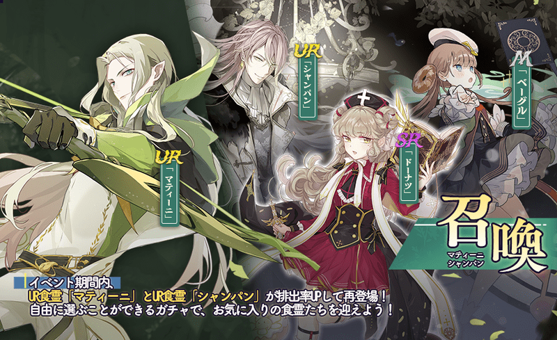 | 内容 | イベント期間内、UR食霊「マティーニ」とUR食霊「シャンパン」が排出率UPして再登場!自由に選ぶことができるガチャで、お気に入りの食霊たちを迎えよう! |