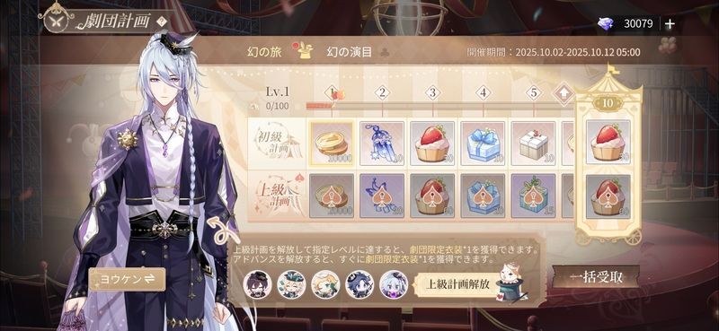 - 上級計画(900円)を購入すると、おでかけ用の廻る奇想劇団シリーズ衣装を含むレベル1~30の上級報酬が解放されます。