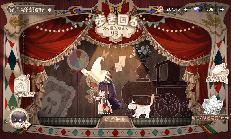 ホーム画面下部メニュー【劇団】から廻る奇想劇団の画面に進むことができます。イベントに参加すると自動的に旅が始まり、一定の距離を進んで目的地に到着するとミニイベントやイベントストーリーが発生します。