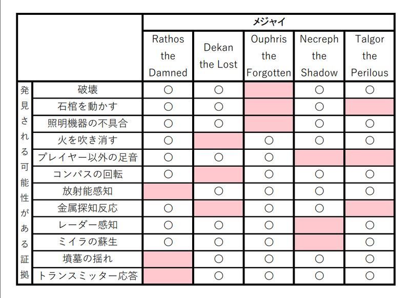 | 発見される可能性がある証拠 | 遺跡内の揺れ | ☥ | ☥ | ☥ | ☥ | |