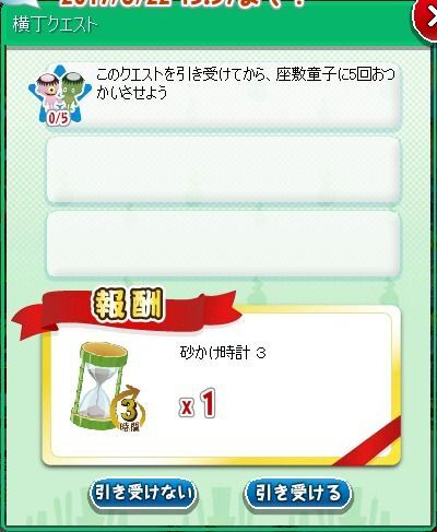 | 1 | このクエストを引き受けてから、座敷童子に5回おつかいさせよう | 砂かけ時計 3x1 | ![]() |