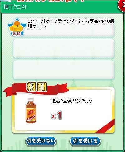 | 1 | このクエストを引き受けてから、どんな商品でも10個販売しよう | 退治P回復ドリンク(小)x1 | ![]() |