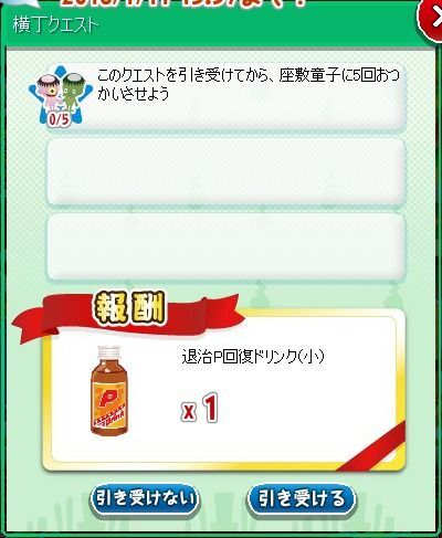 | 1 | このクエストを引き受けてから、座敷童子に5回おつかいさせよう | 退治P回復ドリンク(小)×1 | ![]() |