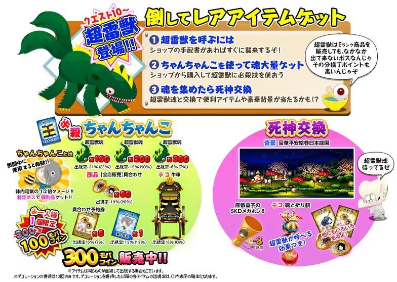 | 【中級】超雷獣を退治にゃん | このクエストを引き受けてから、自分の横丁に襲来した超雷獣Lv45以上を1回退治しよう | 【全店販売】貝合わせ 予約券x10 | ![]() |