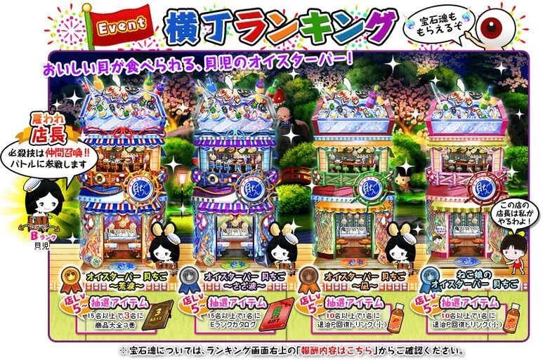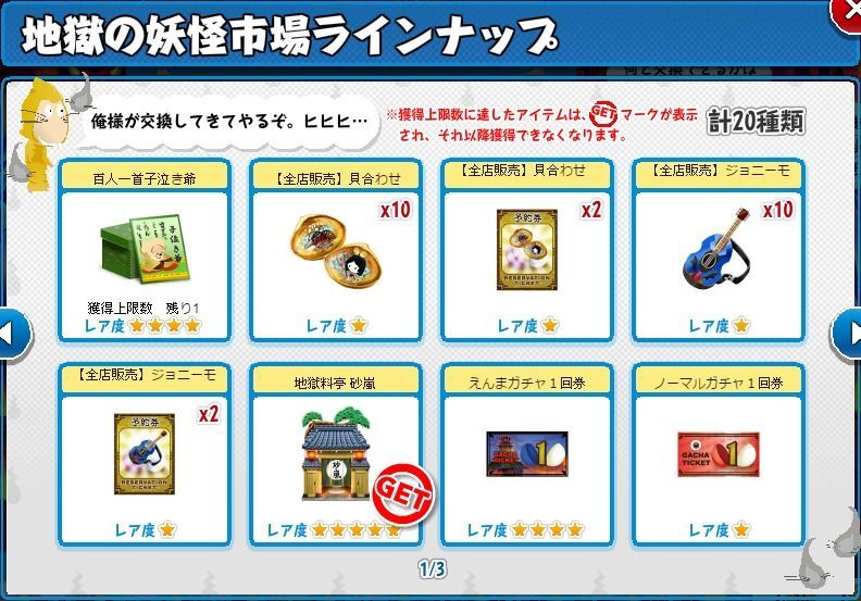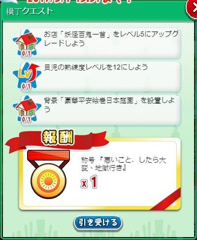 | 14 | お店「妖怪百鬼一首」をレベル5にアップグレードしよう 貝児の熟練度レベルを12にしよう 背景「豪華平安絵巻日本庭園」を設置しよう | 称号『悪いこと、したら大変、地獄行き』 | ![]() |