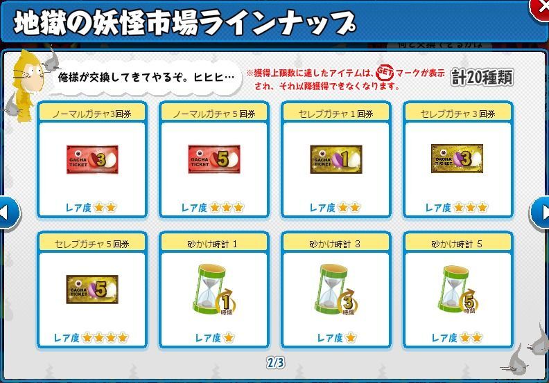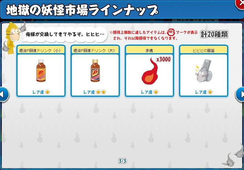 | 5 | このクエストを引き受けてから、ねずみ男交換屋で3回交換しよう | 受注ボーナス:地獄の片道切符x2 砂かけ時計 5x1 | ![]() |