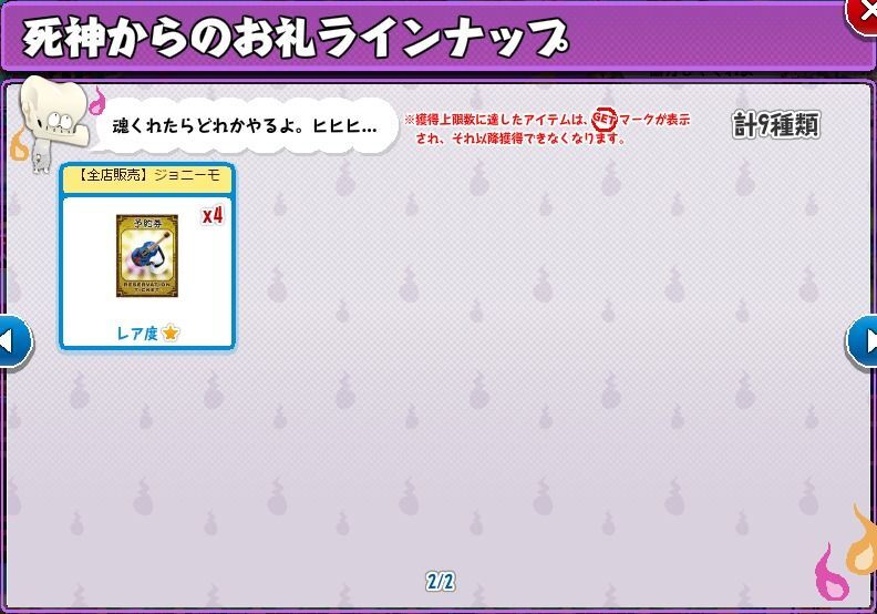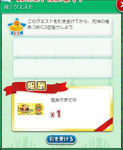 | 11 | このクエストを引き受けてから、死神の魂あつめに3回協力しよう | 極楽行き切符x1 | ![]() |