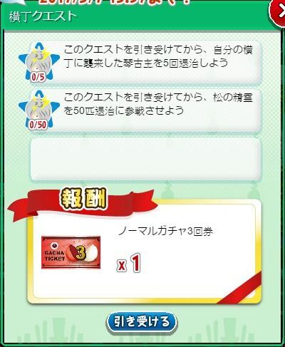 | 4 | このクエストを引き受けてから、自分の横丁に襲来した琴古主を5回退治しよう このクエストを引き受けてから、松の精霊を50匹退治に参戦させよう | 受注ボーナス:【全店販売】書道筆妖松 予約券x2 ノーマルガチャ3回券x1 | ![]() |