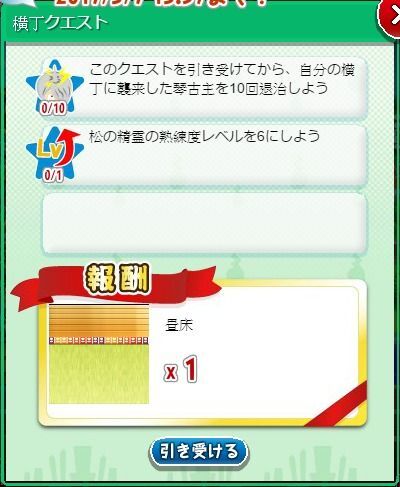 | 8 | このクエストを引き受けてから、自分の横丁に襲来した琴古主を10回退治しよう 松の精霊の熟練度レベルを6にしよう | 畳床 | ![]() |