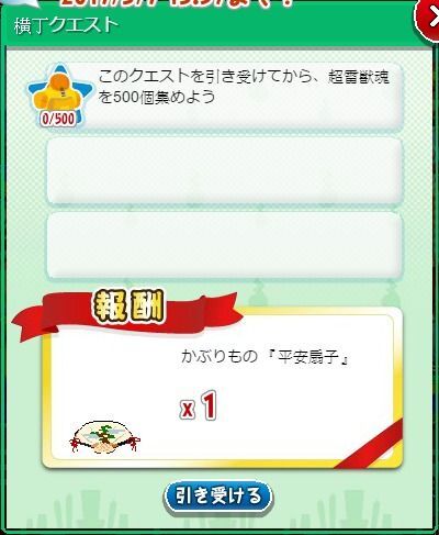 | 12 | このクエストを引き受けてから、超雷獣魂を500個集めよう | かぶりもの『平安扇子』 | ![]() |