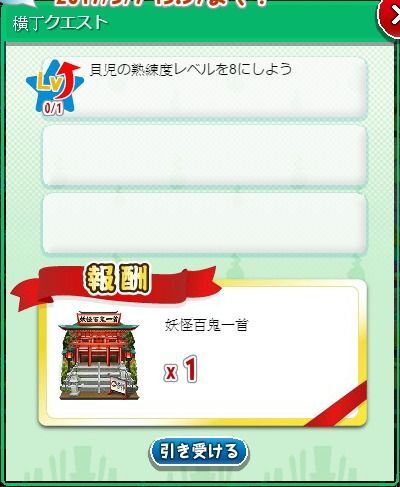 | 13 | 貝児の熟練度レベルを8にしよう | 妖怪百鬼一首 | ![]() |