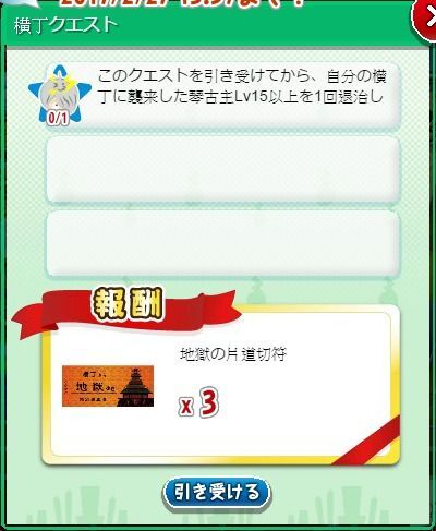 | 2 | このクエストを引き受けてから、自分の横丁に襲来した琴古主Lv1以上を1回退治しよう | 百人一首鬼太郎x1 | ![]() |