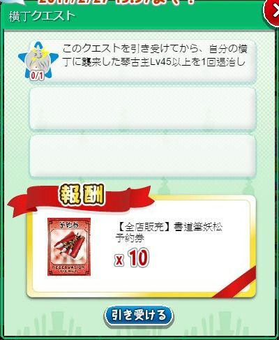 | 【中級】琴古主を退治するにゃん | このクエストを引き受けてから、自分の横丁に襲来した琴古主Lv45以上を1回退治しよう | 【全店販売】書道筆妖松 予約券x10 | ![]() |