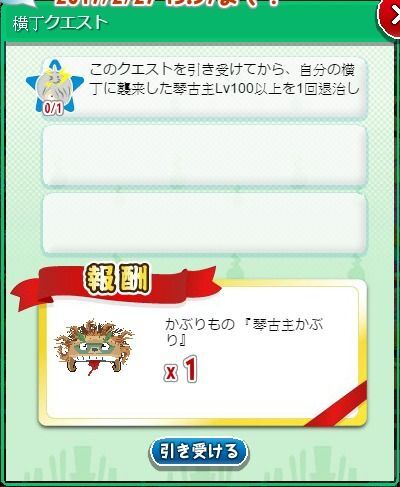 | 【上級】琴古主を退治じゃ | このクエストを引き受けてから、自分の横丁に襲来した琴古主Lv100以上を1回退治しよう | かぶりもの『琴古主かぶり』 | ![]() |