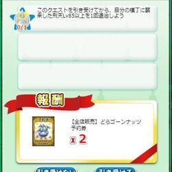 | 上級3 | このクエストを引き受けてから、自分の横丁に襲来した刑天Lv85以上を1回退治しよう | 【全店販売】どらゴーンナッツ 予約券×2 | 108026 | ,,100) |