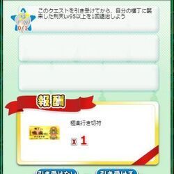 | 上級2 | クエストを引き受けてから、自分の横丁に襲来したボス妖怪を5回退治しよう(ご当地除く) このクエストを引き受けてから、ばくを70匹退治に参戦させよう | 極楽行き切符×1 | |