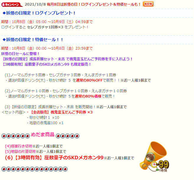 - 2021/10/7 14:00~10/11 13:59 妖怪の日チャレンジクエスト なんでも妖怪をあつめて横丁ボスを退治しよう