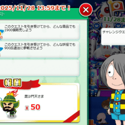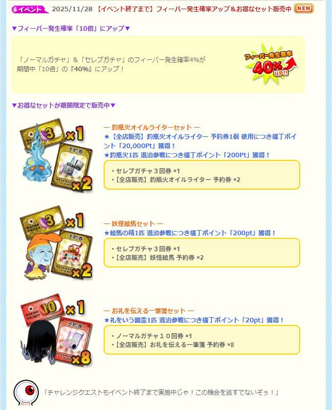 - (終了)11/25 14:00~11/28 13:59 なんでも商品を販売して妖怪を退治参戦させよう