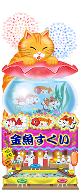 | 説明 | 祭り屋台の定番金魚すくい。看板のトラ猫ちゃんも、どの金魚にするか狙いを定めている。赤か、黒か…レアなリュウキンやランチュウなどもいる!1枚のポイが破れるまでにどれだけの金魚をすくえるかな?ポイの扱いにはコツが必要。 | |