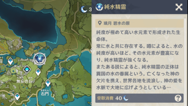 純粋精霊 | ![]() 【フィールドボス】 水の元素生物を召喚してきます。火力が高いので、炎元素や草元素キャラで攻略しましょう |