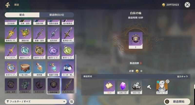 白辰の輪は鍛冶屋で鍛造して入手することができます。レシピの入手は世界任務「影向祓」をクリアして入手できます。「影向祓」は稲妻で受注できます。
