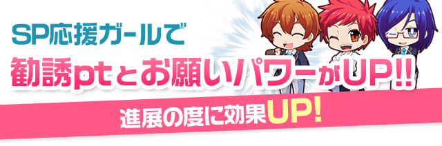 SP応援ガールを所持していると、勧誘勝負・部室へのイタズラをした時に得られる勧誘ptがUPします。