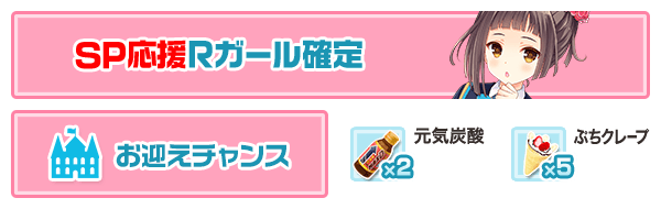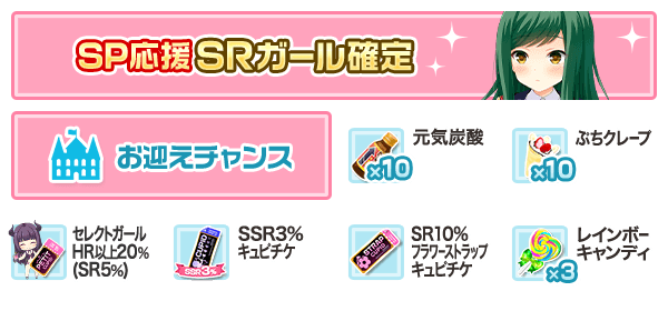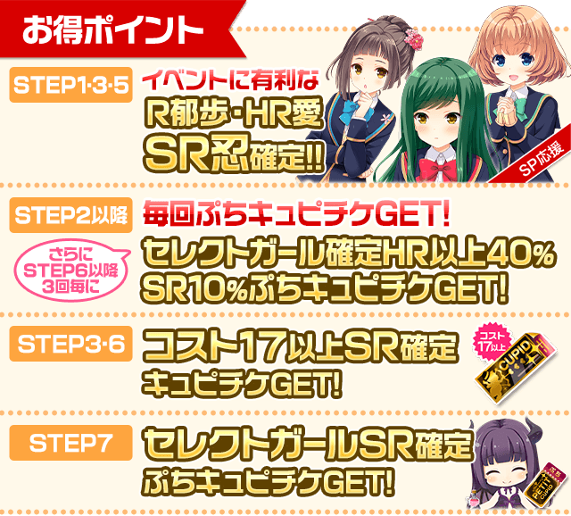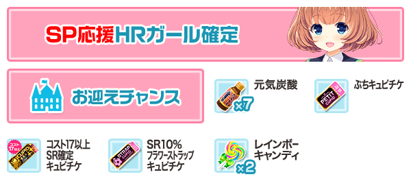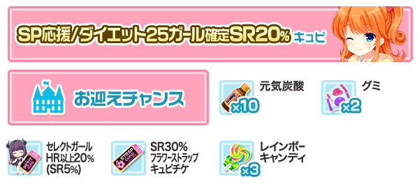 ※「SP応援/ダイエット25ガール確定SR○%キュピ」は、SR[ダイエット25]相楽エミ、SR[ダイエット25]望月エレナ、SR[ダイエット25]川淵一美、SR[ダイエット25]九重忍、HR[先輩エール21]小倉愛、R[防災訓練16]伊勢崎郁歩のうちいずれかのガールと必ず出会え、中でもSRガールの出現割合が○%のキューピッドです。