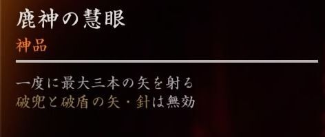 ![]() 鹿神の慧眼 (短弓) | 一度に最大三本の矢を射る。破兜と破盾の矢・針は無効 |