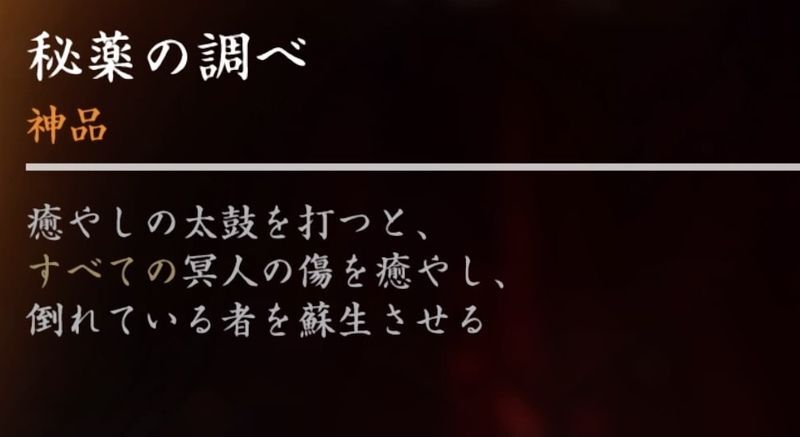 ![]() 秘薬の調べ (???) | 癒しの太鼓を打つと、すべての冥人の傷を癒し、倒れている者を蘇生させる |