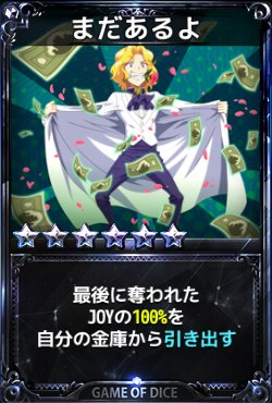 | BLACK | 100% | ・スキルカード獲得時、50%確率で全キャラクターから所持金の15%を奪う |