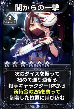 | スキル効果 | 次のダイスを振って初めて通り過ぎる相手キャラクター1体から所持金の25%を奪って到着した位置に呼び込む |