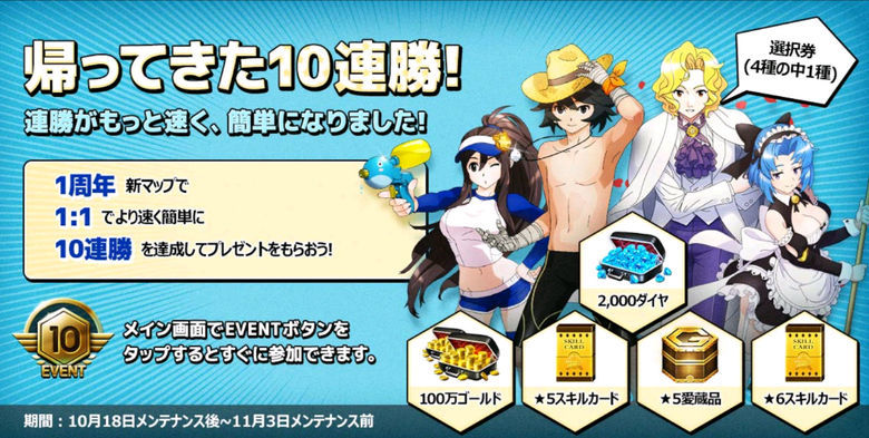 - 初期の頃に実装されていた連勝イベントが1周年記念に復活