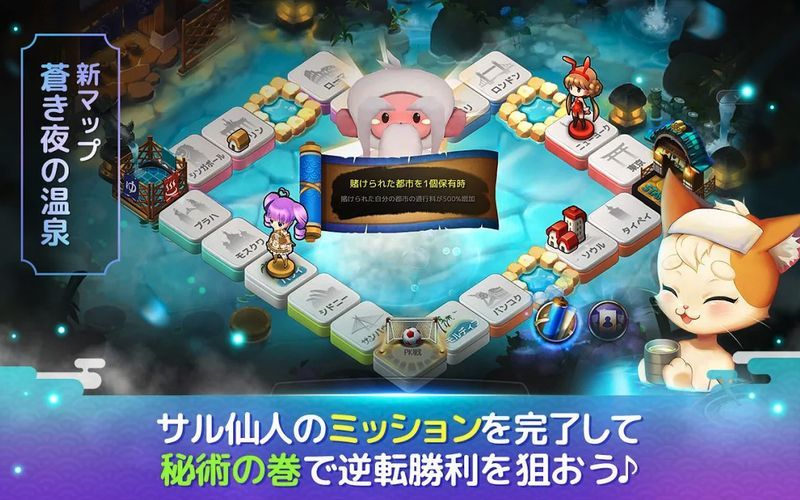 「蒼き夜の温泉」は、まるで昔話のように温泉に現れたサル仙人から「巻物」を貰い、その巻物に書かれたミッションをクリアすることで特別なプレゼント(ゲームの中ではランダムなバフ効果)を貰うという仕組みになっております。