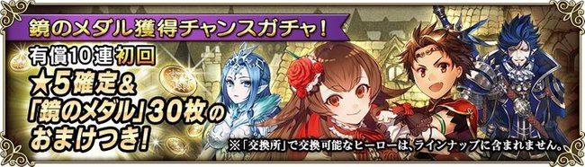 期間中に「鏡のメダル獲得チャンスガチャ」の有償10連ガチャをまわすと初回のみ☆5ヒーローが必ず出現!