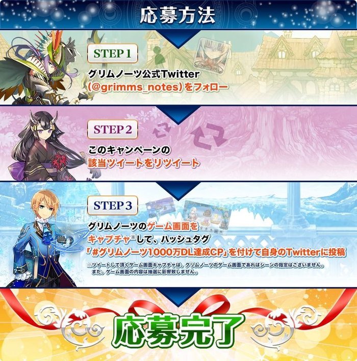 グリムノーツ公式Twitterアカウント(@grimms_notes)をフォローし、Tweetすることで豪華なアイテムが貰えるキャンペーンを開催します!
