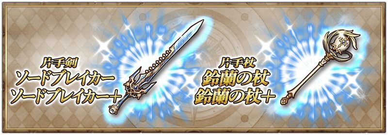今回の限定武器は、片手剣「ソードブレイカー/ソードブレイカー+」と、片手杖「鈴蘭の杖/鈴蘭の杖+」