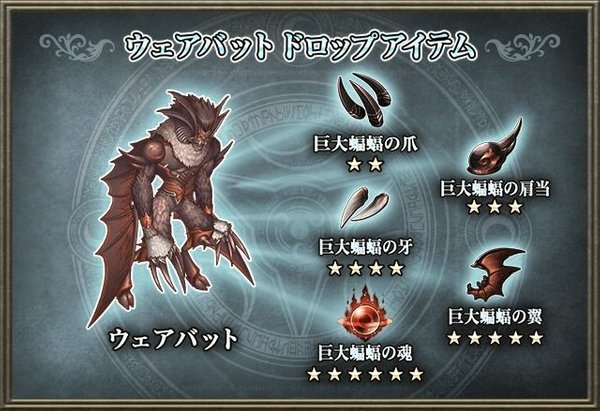 | 通常 | 巨大蝙蝠の牙、巨大蝙蝠の翼、巨大蝙蝠の魂 | |