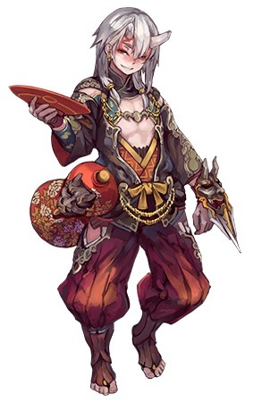 | 物語 鬼ヶ島の生き残りである鬼の姫。桃太郎を恨み、正体を隠して近づいたが彼の心根を知るうちに、桃太郎を愛するようになる。 (出典:桃太郎元服姿) | |