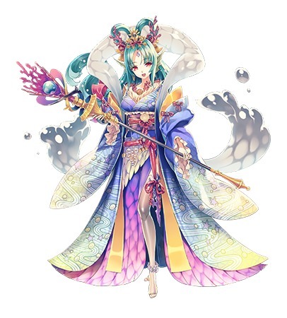 | 物語 容姿端麗な深海の姫君。龍神の娘であり、竜宮城で暮らしている。亀の姿になって地上へ時折出ていたが、子供にいじめられていたところを浦島太郎に助けられ、恋に落ちた。 (出典:浦島太郎) | |