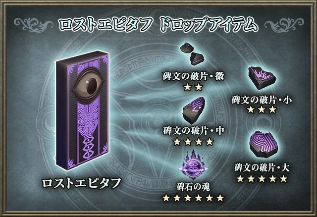 | 通常 | 碑文の破片・小、碑文の破片・中、碑文の破片・大、碑石の魂 | |