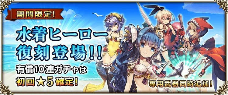 復刻水着ヒーロー登場ガチャの有償10連ガチャをまわすと初回のみ☆5ヒーローが必ず出現!