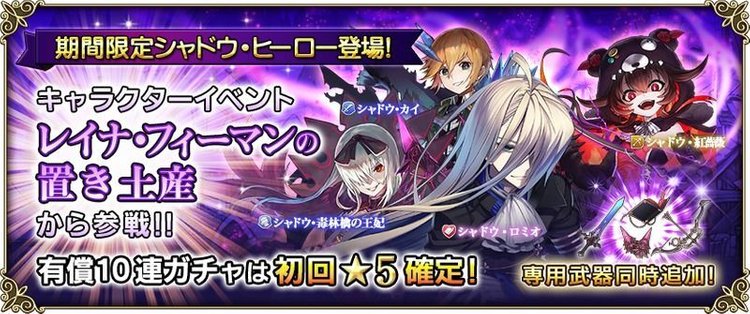 シャドウ・ヒーロー登場ガチャの有償10連ガチャをまわすと初回のみ☆5ヒーローが必ず出現!