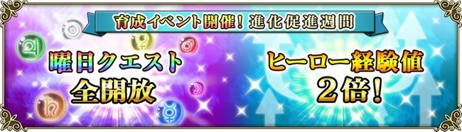 イベント期間中、「イベントの想区」の「曜日クエスト」を全開放、曜日クエストにてヒーローの取得経験値が2倍になります!!