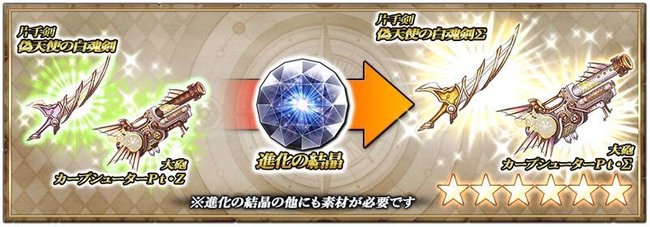 「進化の結晶」などの素材を使用することで、☆5武器「偽天使の白魂剣」と「カープシューターPt・Z」を☆6武器へと進化させることができます!