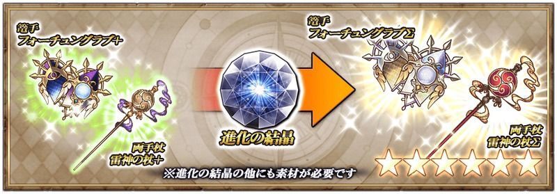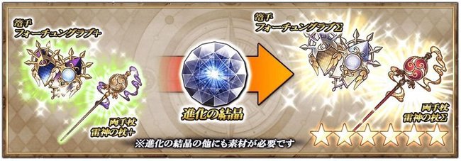 「進化の結晶」などの素材を使用することで、☆5武器「フォーチュングラブ+」と「雷神の杖+」を☆6武器へと進化させることができます!