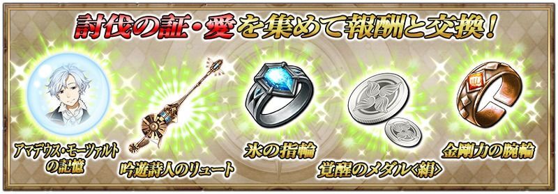 交換所にて、「討伐の証・愛」を使用して「アマデウス・モーツァルトの記憶」を獲得できます。