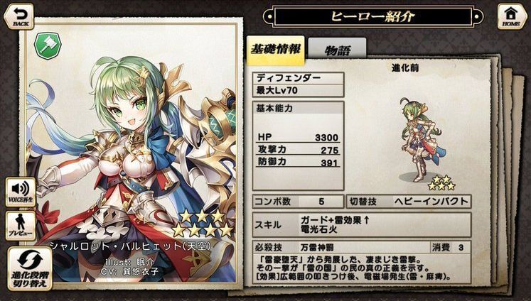 | 進化 | ★5シャルロット(天空)>★6シャルロット(天空)>★7シャルロット(天空) |