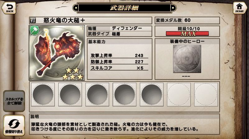| 攻撃必殺装填・中・・・通常攻撃がヒットした時、必殺技ゲージを中充填します。 PT火耐性↑小・・・パーティ全員が火属性を含む攻撃に対して、防御力が10%増加します。 | |